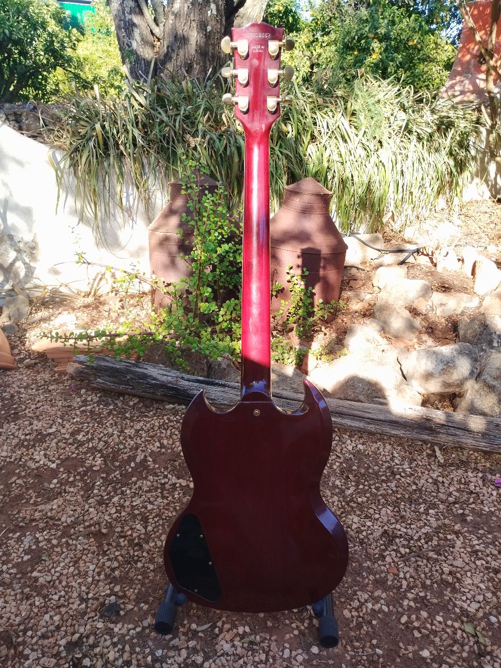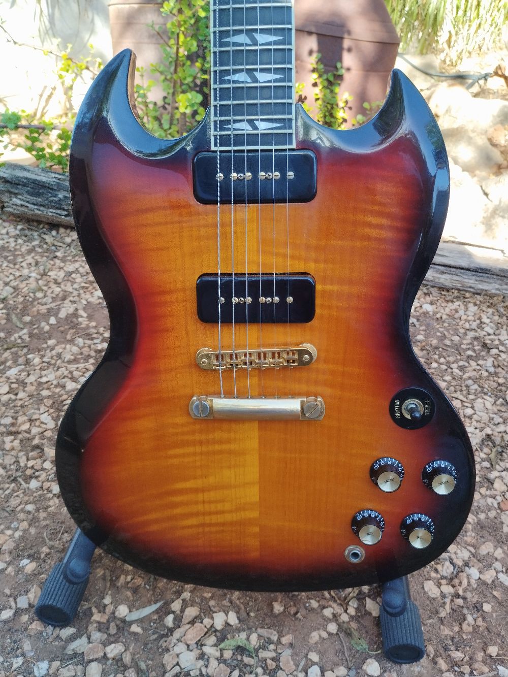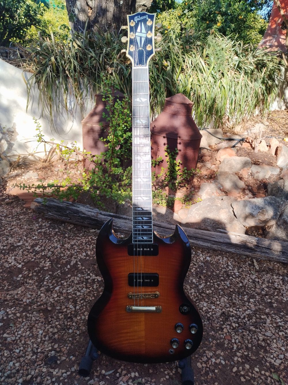 Up for grabs is a 1999 Gibson SG Supreme P90, a beautifully crafted and exceptionally rare SG that delivers everything you’d expect from late-’90s Gibson craftsmanship — and then some. This isn’t your everyday SG. The Supreme model features a carved flame maple top over a solid mahogany body, giving it a perfect balance of warmth, bite, and sustain. The dual P90 pickups provide that classic Gibson growl — raw, articulate, and dynamic — ideal for blues, rock, and vintage tones that cut through the mix without losing body. This is one of those SGs that just feels alive in your hands — articulate, punchy, and full of character. If you’ve been hunting for a top-tier P90 SG that can cover everything from vintage blues to gritty rock tones, this one won’t disappoint. If you love the punch and clarity of P90s but want the sustain and playability of an SG Supreme, this guitar is a dream come true. It sings with harmonic richness, snarls when pushed, and feels alive under your fingers. This particular configuration - the SG Supreme with factory P90s - was not a catalog-standard model in 1999, hence is extremely rare, especially in this finish and condition. A beautiful piece for collectors who value both playability and provenance. Collection in hand from Algoz or Sao Bartolomeu de Messines. Not interested in trades, swaps or exchanges.