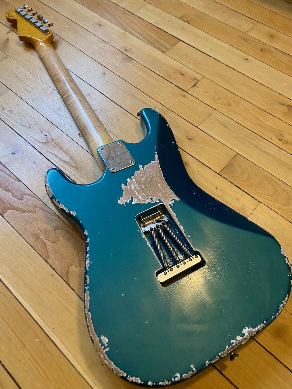 - Corps MJT en aulne 2 pièces léger (3 lbs 10oz), finition Metallic Lake Placid Blue avec sublime relic et weather checking. soigneusement blindé au cuivre pour éviter tout buzz ou ronflement intempestif.