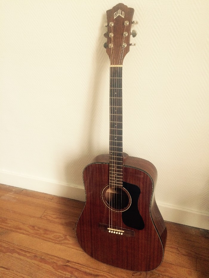 Vendue avec l'étui rigide guild. Un super rapport qualité prix.