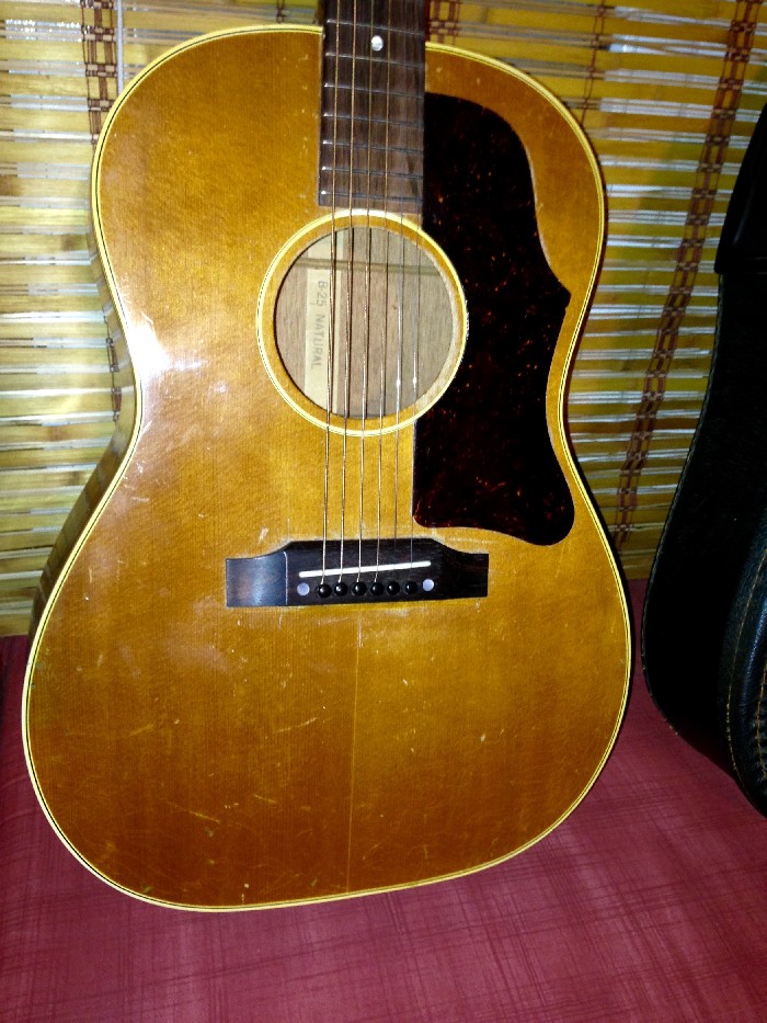 Gibson B25 de 1965 en parfait état de jeu, jouabilité excellente, action basse ( 2mm Mi aigu à la 12ème frette, 2,8 Mi grave) avec possibilité de baisser encore si souhaité, reste de la matière au niveau du sillet de chevalet.