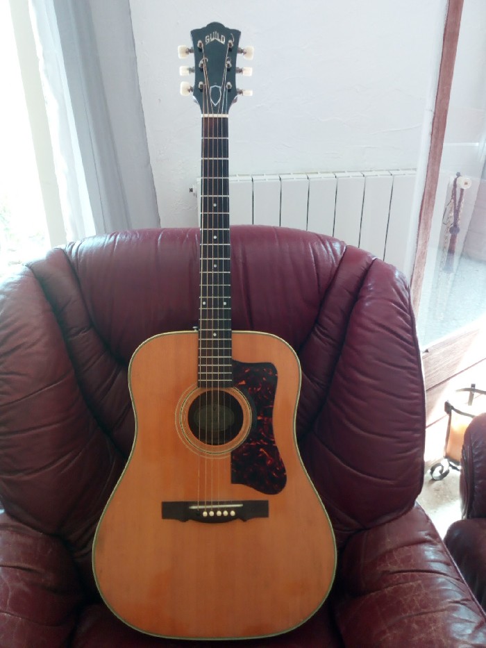 Vends guitare acoustique GUILD d40, de 1964. Les mécaniques ne semblent pas d’origine, en excellent état avec son flight (état moyen)