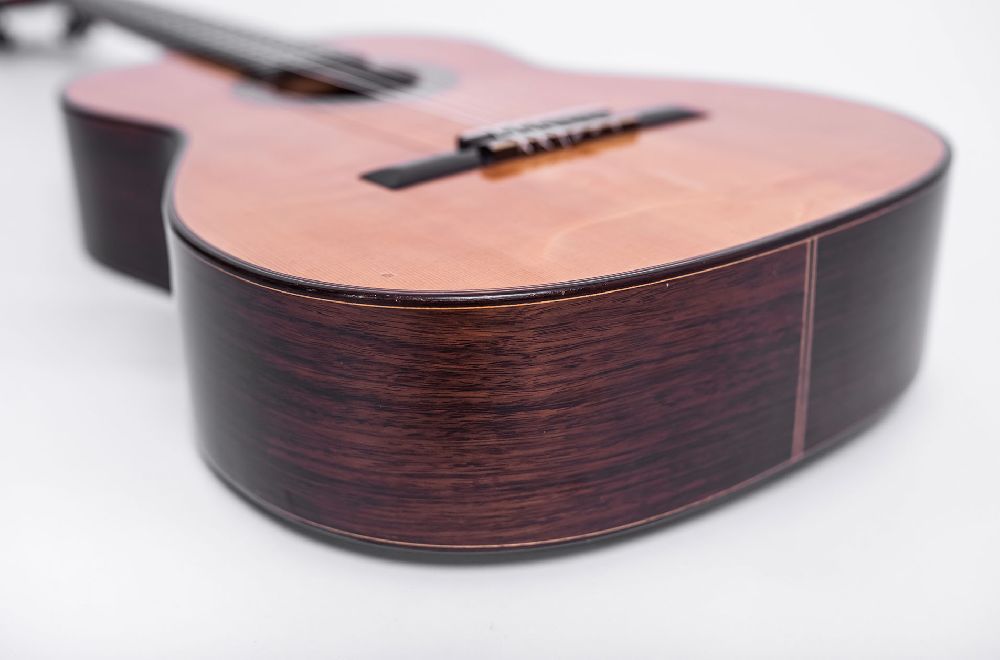 This guitar was built in 1990. Its notes are homogeneous and well defined; the bass is deep, the treble is clear and precise. It is a very lyrical instrument with great musicality.